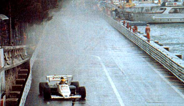 Allerede om søndagen beviste han hvorfor. Det regnede og regnede så vandet sejlede rundt i gaderne. Mange snakkede om at udsætte løbet med Alain Prost i spidsen. Men løbets hovedkommissær, Den hårdkogte Jacky Ickx, ville ikke høre tale om det, og de tyve biler måtte stille til start. Alain Prost tog hurtigt føringen, men han havde problemer med både turboen og bremserne i løbet. I hvert fald ifølge ham selv. Senna havde ikke problemer med noget som helst.